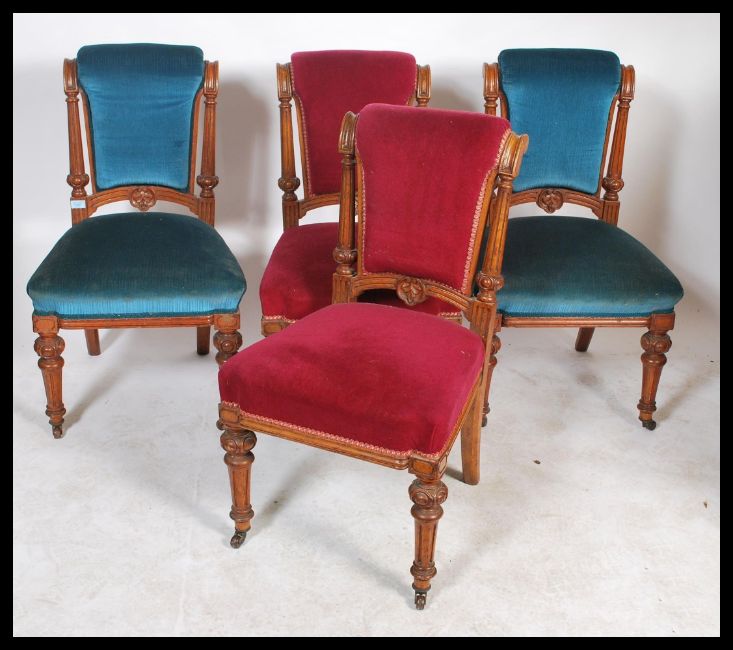 A set of 4 19th century mahogany dining chairs in the manner of Lamb of Manchester. Raised on reeded tapering legs with two tone velour upholstered seats and back rests with show wood frames