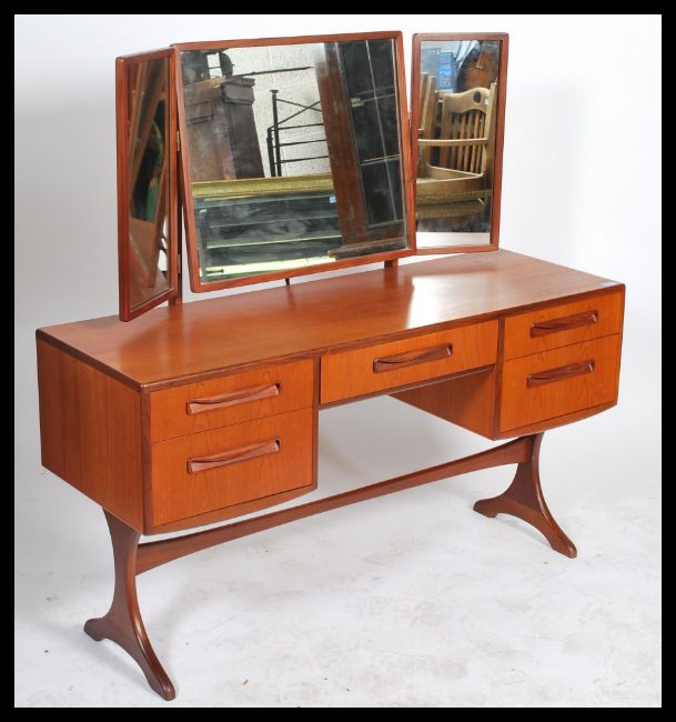 A 1970's G-Plan teak wood dressing table in the manner of Mogens Kolo. The dressing table raised on angular legs with stretcher having a wide body  with banks of drawers, dressing top with triptych mirror to rear