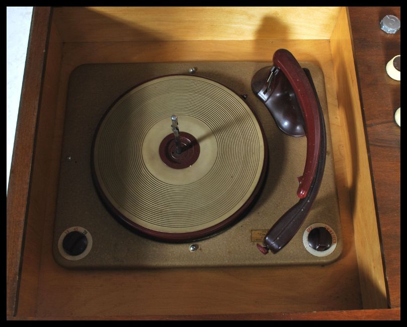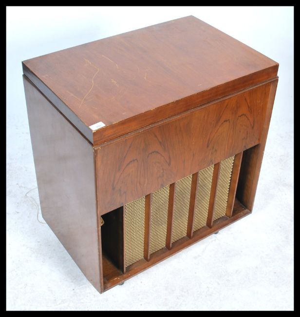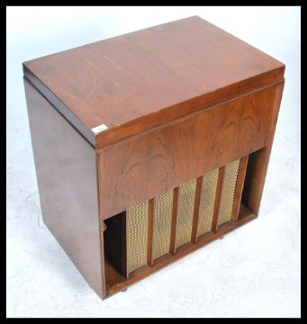 A vintage mid 20th century walnut cased Marconi Marconiphone radiogram, hinged top with speaker to the front with the original purchase receipt for 1955, together with a selection of 78rpm records. Measures 76cm x 69cm x 46cm.