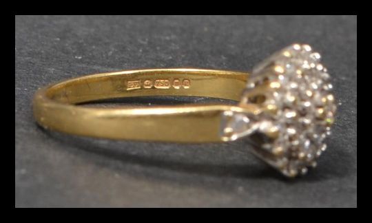 A hallmarked 18ct gold and diamond cluster ring having round cut diamonds set in concentric circles . Hallmarked London.  Diamonds approximately 40pts. Total weight 4g. Size O.