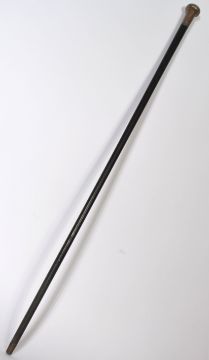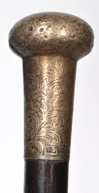 An early 20th Century Victorian promenade cane, the silver hallmarked chase decorated pommel raised on an ebonised tapering shaft. London assay mark, dating to 1903 and makers mark for Thomas Davis