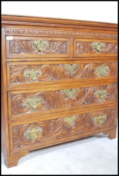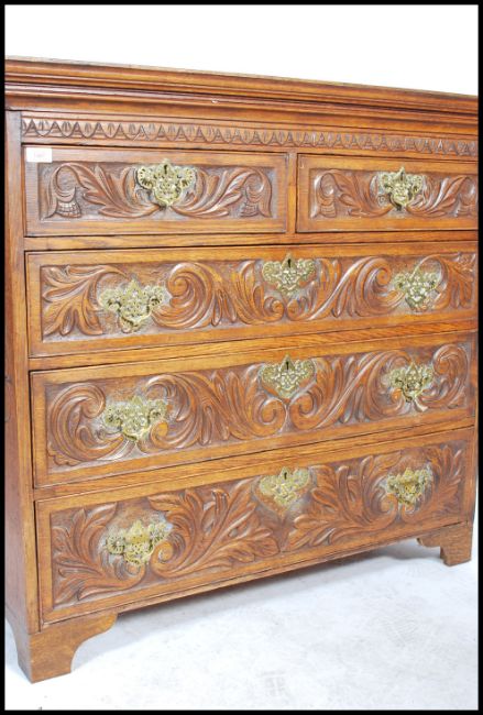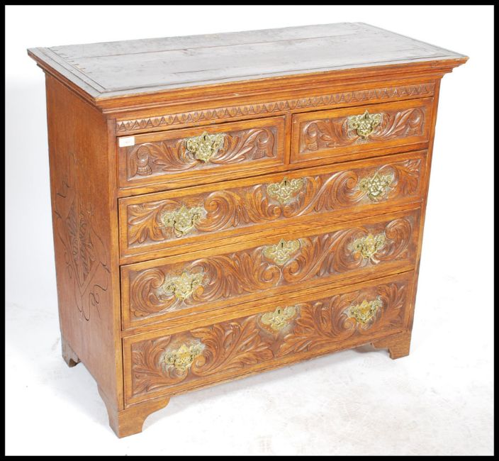 A 19th century country oak chest of drawers, two short drawers over three long drawers, swag drop brass handles raised on bracket feet. The drawers and sides carved with ornate detail, Measures 99cm x 111cm x 53cm.