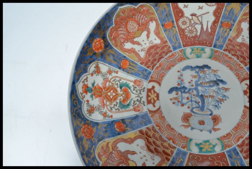 A 19th century Japanese Imari Charger of large circular form having various white cartouche panels depicting traditional scenes with central still life medallion to centre. Blue and white decoration to underside. Blue ground with gilt details. Measures 47 cm diameter.