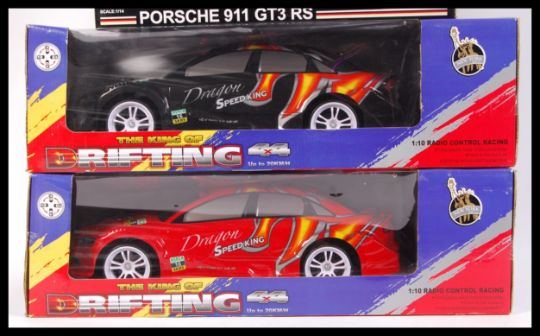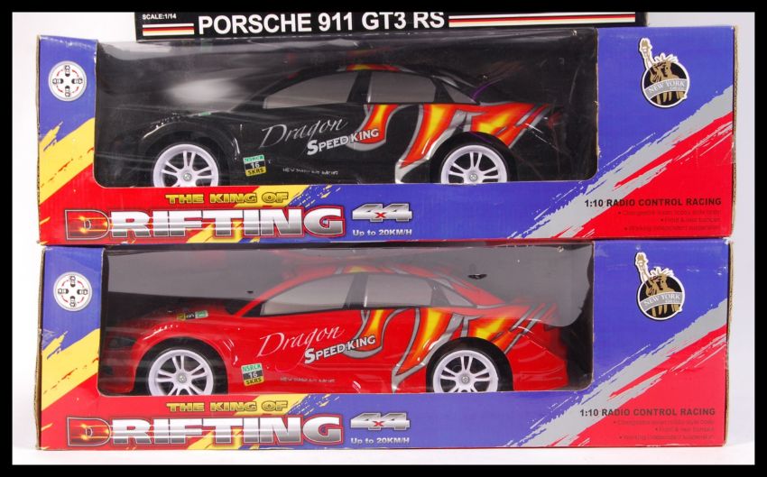 Three various branded RC Radio Controlled cars to include; Rastar 1:14 scale Porsche 911 GT3 RS & 2x New York Gift Co. 1:10 scale Drifting 4x4 cars. All appear unused & within their original boxes.
