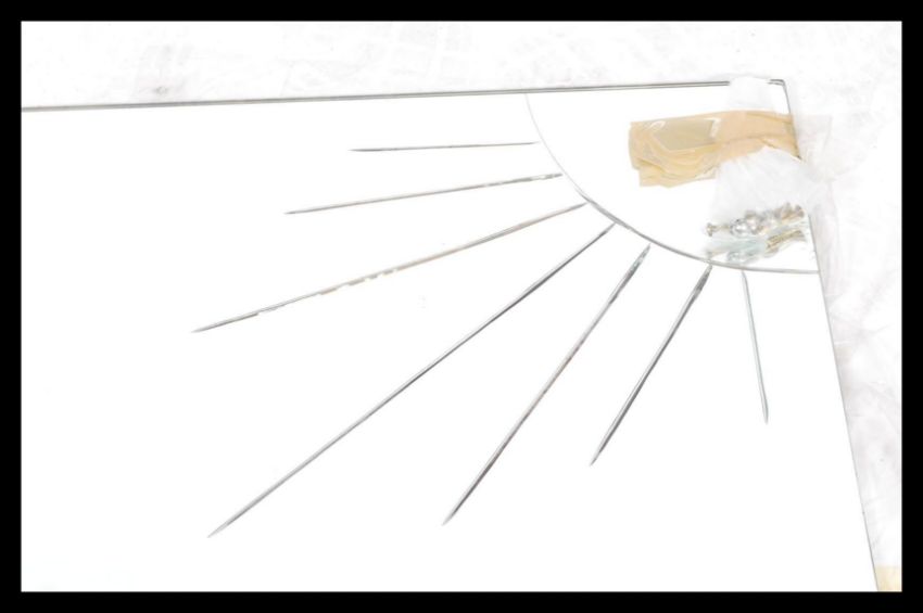 A 1930's style art deco frameless wall mirror of square form being acid etched with sunburst decoration to the corner