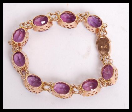 A superb vintage 14ct gold and synthetic alexandrite / colour change sapphire bracelet being set with 9 faceted oval cut stones in coronet style mounts having an oval clip clasp. The stones having purple and green blue hues. Marked 14k tests 14ct gold. Each stone measures approx 12mm x 8mm. Total weight 24.7g. Length 7 1/4 inches.