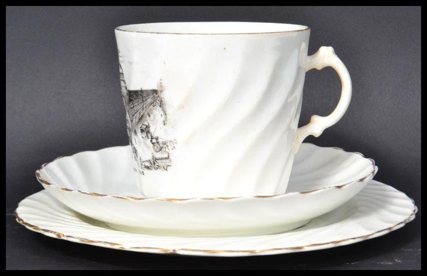 Local Interest : A 19th century Victorian cup saucer and side plate trio for the Bristol Exhibition 1893 with transfer printed image. Hidden makers mark to image W. Lansdown China Merchant Castle Street. Side plate measures 18 cm diameter.