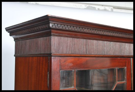 An early 19th Century Edwardian mahogany bookcase cabinet, two long glazed doors over two short panel doors, adjustable shelves to the inner.