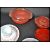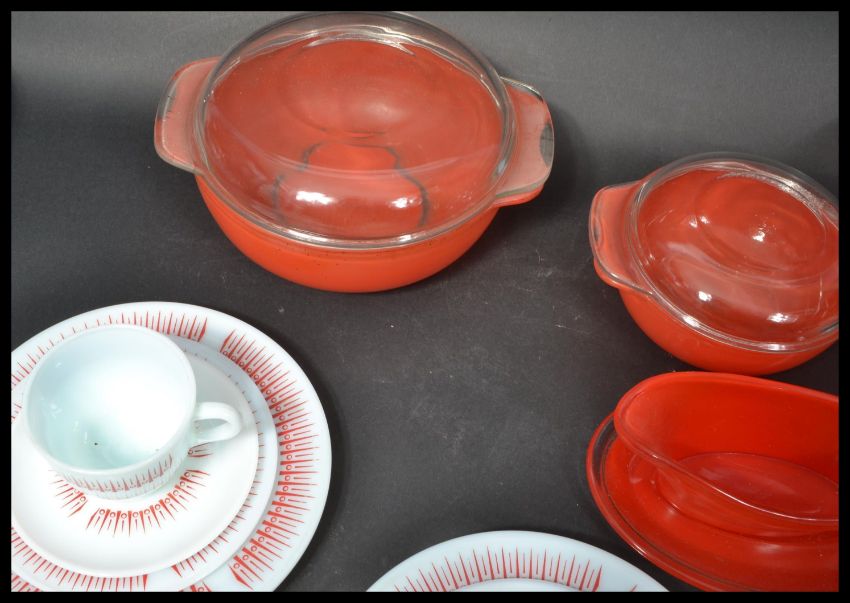Pyrex - A 1950's vintage retro glass set of cups and saucers in white with a red starburst pattern to include casserole dishes and others.