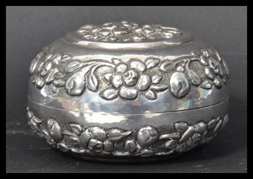 A 19th century Chinese silver (tested) lidded trinket pot cast in relief with flowers and leaves. Weighs 81.1 grams. Measures 6 cm high and 9 cm diameter.