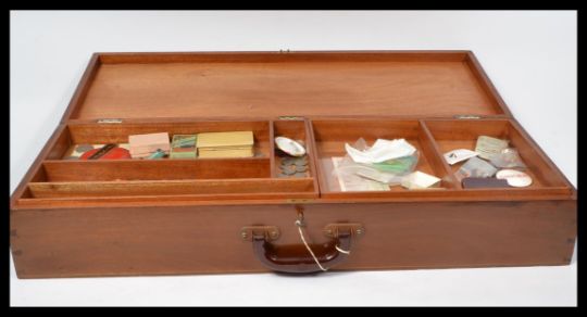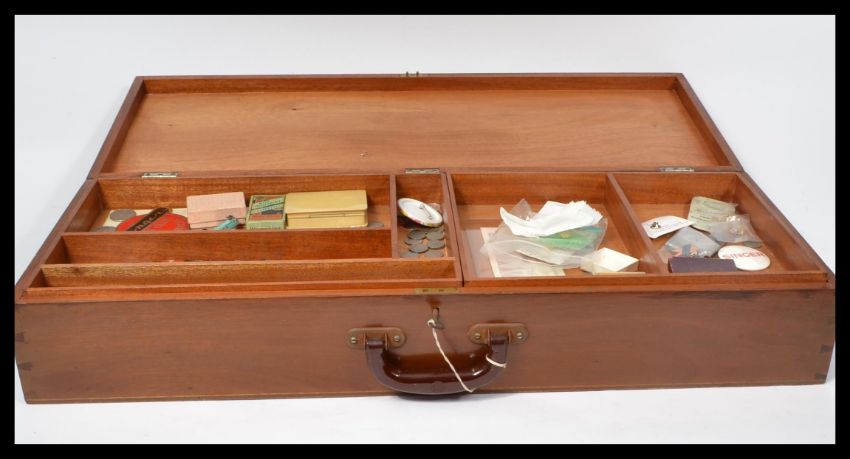 A vintage 20th Century wooden portable storage case, hinged top opening to reveal two removable slides, contents to include vintage coins, badges, gents watch, slide rules, drawing apparatus etc please refer to images. Carry handle to the top. Case measures 14 cm high, 76.5 cm wide and 29.5 cm deep.
