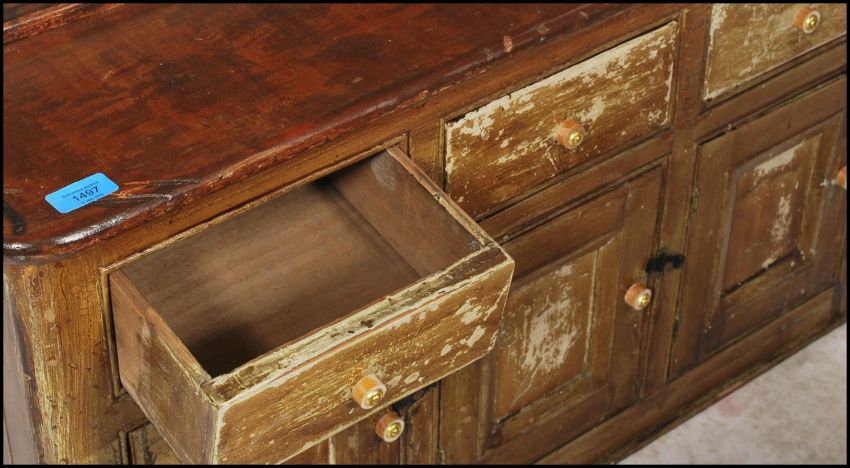 A 19th century Victorian scratch-built miniature child's dresser consisting of three drawers over three cupboards with open shelved dresser top.