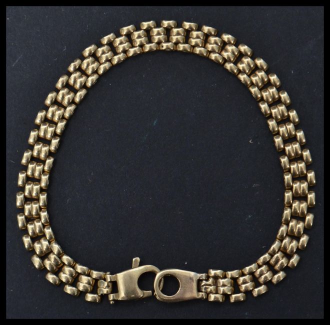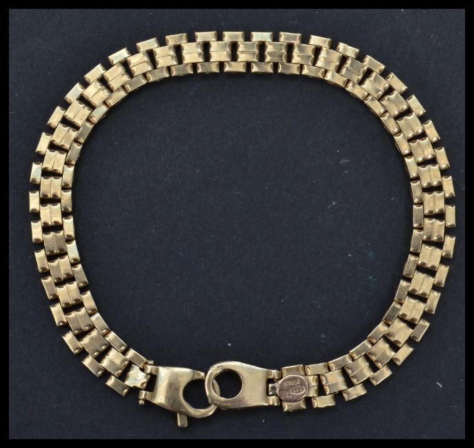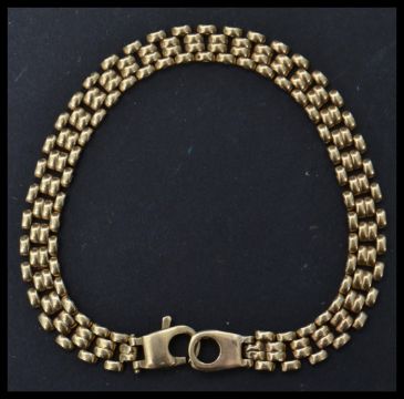 A 9ct gold Italian designer bracelet chain having a claw and ring clasp. Weighs 9.5 grams. Measures 20.5 cm long.