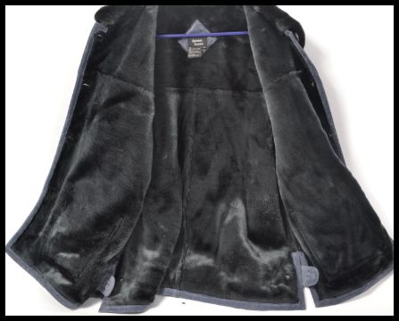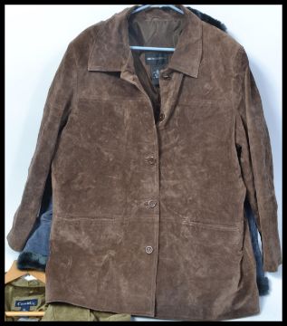 A group of three vintage style coats to include a XL leather 3/4 jacket in a moss finish together with another suede XL jacket and another XL brown suede 3/4 length jacket.