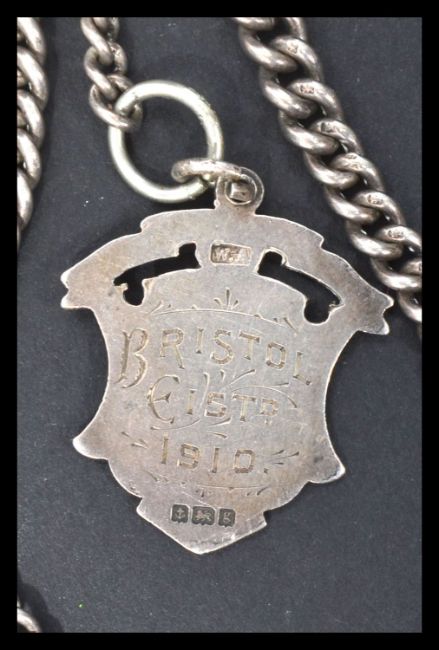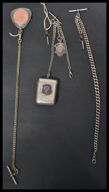 A hallmarked silver pocket watch Albert chain with pocket watch key along with another silver hallmarked example with silver fob and a vesta case. Also another white metal Albert chain.