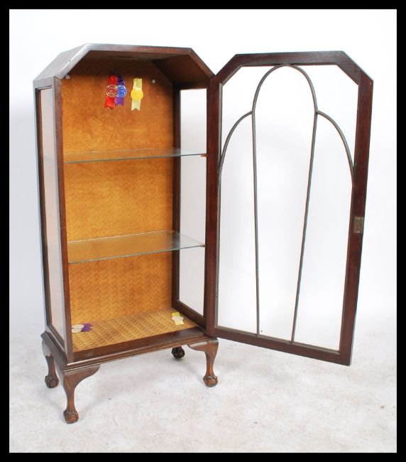 A vintage early 20th century oak cased single glazed door display cabinet raised on cabriole legs on ball and claw feet. 125x57x32