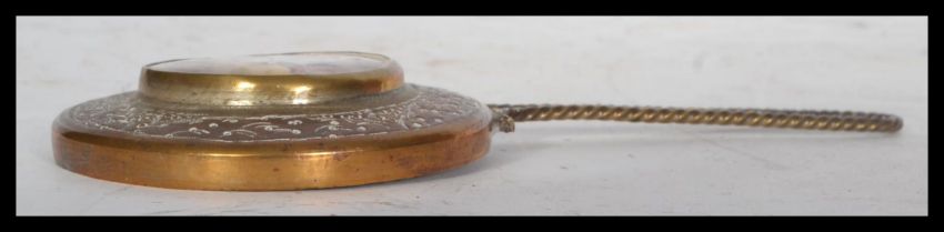 A 19th century Chinese hand held mirror. Copper and brass construction having a copper twist design handle with circular chase decorated brass head, inset mirror with a hand painted  mother of pearl panel of three horsemen to the verso. Measures 15 cm long.