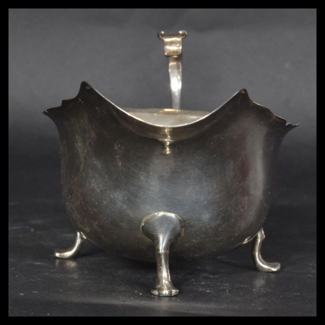 An Edwardian hallmarked silver sauce boat / creamer jug with cast shaped rim and S-scroll handle, raised on three out swept legs to stepped hoof feet, Horace Woodward & Co Ltd, Birmingham 1908. Weighs 94.1 grams. Measures 8 cm high and 15 cm deep.