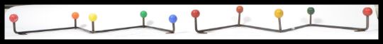 A pair of vintage mid 20th century Sputnik Atomic Space Age coat hooks having ebonised zig-zag backs with coloured ball finial ends. Measures: 45cm wide.