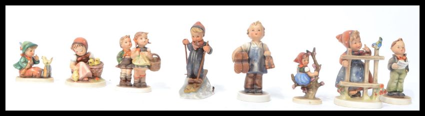 A collection of eight 20th Century ceramic figures of children in various poses by Hummel all stamped to the base. Highest measures 14 cm.