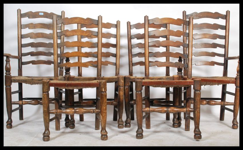 A set of 6 20th century country oak ladderback dining chairs. Raised on turned legs united by peripheral stretchers having rattan weave seats and ladder back tall backrests to the rear. 108x52x43