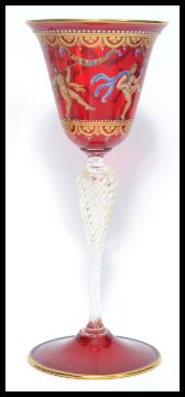A vintage 20th century Murano / Venetian studio glass wine glass raised on a twisted stem hand coloured painted panels. Measures 19 cm high.