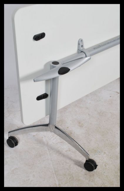 A contemporary design Senator S21 folding flight table - dining table. Raised on chrome legs with locking castors wheels having a fabulous white composite top that slides and drops down to store
