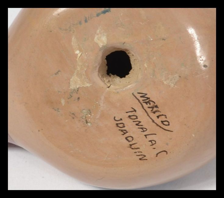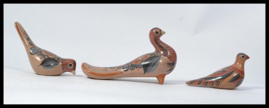 A set of three retro graduating ceramic / pottery figures of Quails, each hand painted designs with examples by the Cora Indians, Jalisco, Mexico, Guadalajara Pottery of Mexico etc. Measures 16 cm high.