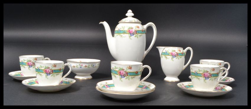 A Royal Doulton Estelle pattern tea service with printed floral bouquets within blue borders. Consisting of tea pot teapot , cups , saucers etc. Please see images.