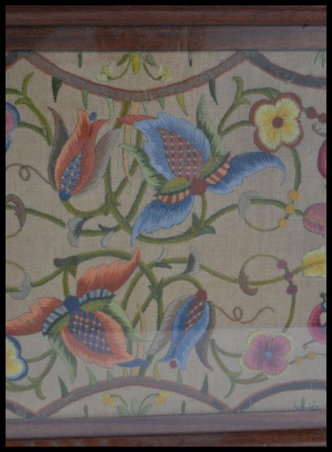 A 19th century mahogany and needlepoint inlaid butlers serving tray. The mahogany frame with gallery surround having stunning inset needlepoint of colourful birds and fauna. Measures 52.5 cm wide.