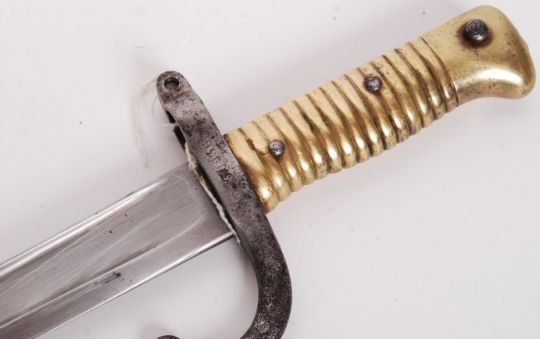 A antique 19th century French 1866 pattern chassepot sword bayonet, with brass handle. With engraved French text to side of blade, dated 1871. No. T30036. Within the original scabbard, AB283. Measures 70cm long.