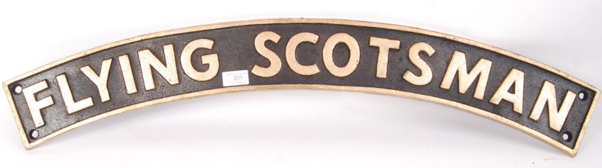 A 20th century vintage style Railway ' Flying Scotsman ' locomotive cast iron plaque. Black, with painted raised lettering. Measures 89cm wide.