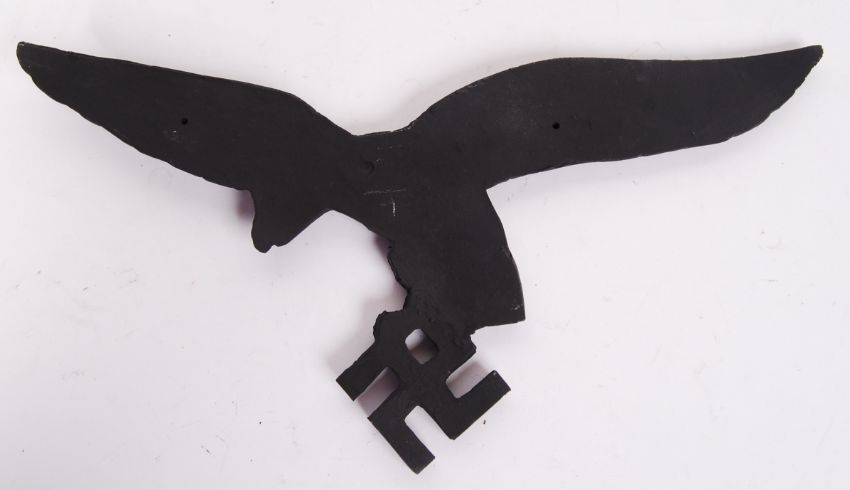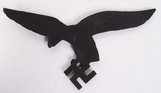 A 20th century reproduction WWII German Third Reich Nazi Party Luftwaffe wall plaque. Metal construction, with mounting holes to either wing. Depicting an eagle carrying a Swastika. Measures approx; 41cm long.