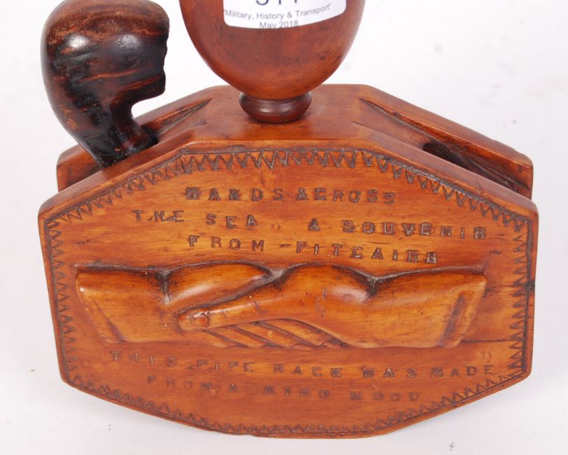 A unique WWII Second World War era carved pipe rack. Punched notation to the front reads ' Hands Across The Sea - A Souvenir From Pitcairn - This Pipe Rack Was Made From A Miro Wood '. Features a pipe and cup to top. Space for three pipes. Measures approx; 16cm wide.