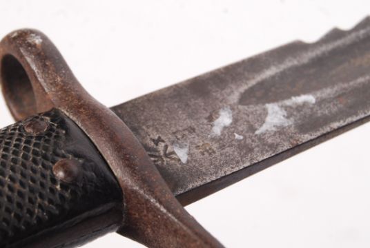 An antique 19th century 1879 pattern Martini Henry rifle sawback bayonet. Various proofing marks and stamps to the ricasso. Chequered grips, with with working push-button. Generally good example. Measures approx; 79cm long.