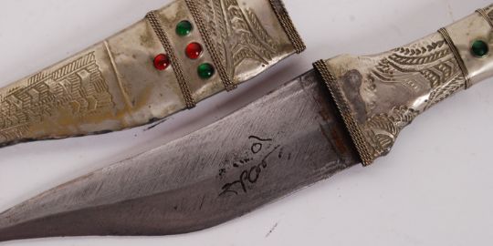 A WWII Second World War period Syrian white metal decorative ceremonial dagger. With Syrian script to blade. Within its original scabbard. Measures 28cm long.