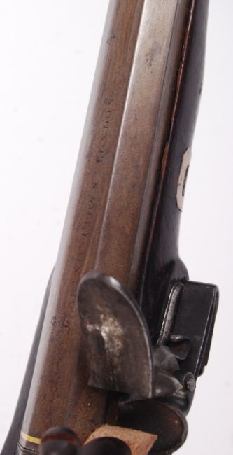 An antique 18th century (believed c1786) John Knubley flintlock pistol. Nickel or silver escutcheon and fore-end. 0.65" bore, bolted lock. Name and address on top of barrel reads ' Knubley - Charing Cross, London .' Measures approx; 38cm long.  John Knubley was a gunmaker and sword cutler to Prince Of Wales, Duke Of Clarence and Prince Edward. He worked at Charing Cross, London in 1786-1793. Died Feb. 1795.