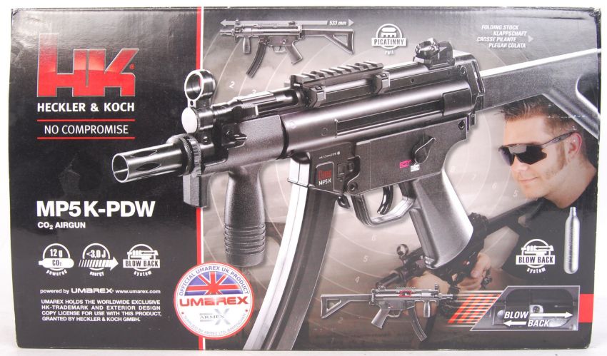 A Heckler & Koch made ' MP5K - PDW ' C02 powered BB airsoft airgun. With folding stock, picatinny rail, empty magazine, butt plate & sight. Within its original box. Measures 53.3cm once fully extended. Working order.