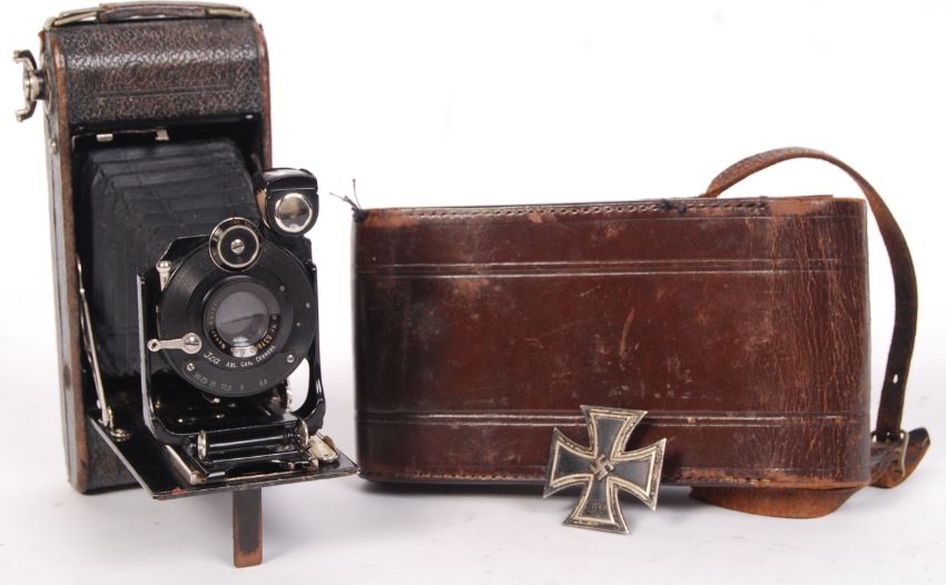An original WWII Second World War Third Reich German Nazi Iron Cross medal (1st Class), likely by Rudolf Wachtler & Lange. Along with a similar period Icarette II ' 500 ' series bellows camera, within its original case.  Provenance: both items were removed from a German Officer by the vendor's father during his time in the Second World War, and brought back home as souvenirs.