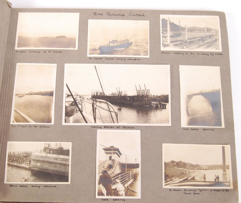 A fascinating 1920's personal photograph album neatly titled ' From New Zealand To Southampton April 26th 1921 - June 5th 1921 ' RMS Corinthic '. Being a White Star Line / Shaw, Savill & Albion ship. The photograph album contains around 100 personal black and white images taken by the family aboard the ship. Various on-board entertainments can be seen (including some kind of show in which the audience participate), various views of the crew and other passengers. A wonderful album.  Note: from the large Fisher / Blomfield family archive consigned to this sale. The collection comprises of items from Francis ' FMB ' Marion Bates Fisher (a famous Edwardian Tennis Player ) and features items from the lives of his entire family (most notably that of his eldest daughter Esther Fisher who went on to become an international pianist, his other daughter was Lady Esther Frances Barron and his youngest daughter Alice Blomfield (nee Fisher) whose husband - Siegfried Blomfield - was a noted soldier during WWII and whose daughter (Juliet Blomfield) went on to become a ballet dancer). The family owned many properties both in the UK and New Zealand, and were extremely well travelled. Their friends and acquaintances were some of the most notable characters of our time - Ernest Shackleton , Winston Churchill , Maxine Elliott , Henry Wadsworth Longfellow , John Singer Sargent but to name a few. An incredible collection, of great social interest.