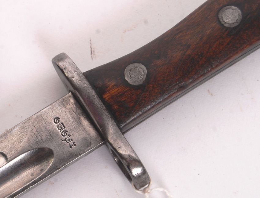 A 19th century 1886 model Siamese Mauser knife bayonet, with Siamese script to top of blade. Within the original steel scabbard. Measures 43cm long.
