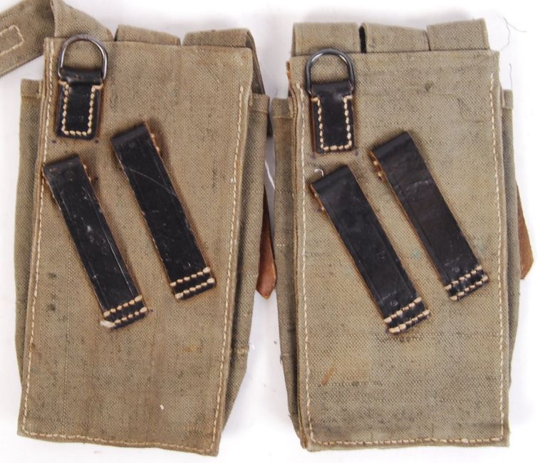 A pair of original WWII Second World War Third Reich Nazi German military MP40 SMG machine gun spare magazine ammo pouches, all with their leather straps.
