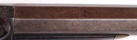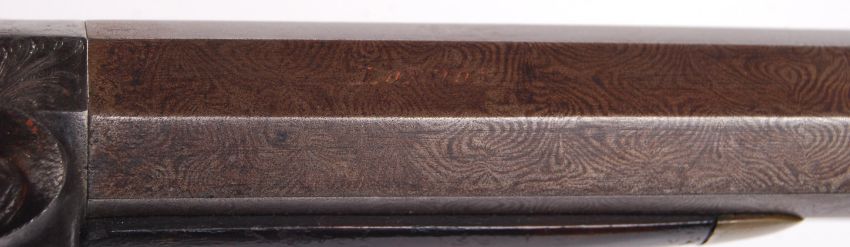 An antique 19th century percussion cap pistol. 0.5" bore. With Damascus barrel, nickel furniture, and ebony ramrod. Beautiful foliate engraving to the walnut chequered stock. Named to lock plate '***RTON' (illegible ). Measures approx; 28cm long.