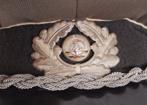 A Post-WWII East German officer's uniform peaked cap. Features the emblem for East Germany to the front, with silver bullion wire beneath. Size: 57.