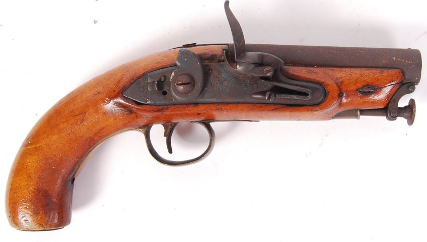 An antique 19th century flintlock pistol - the lock plate stamped ' Tower ' with a GR cipher, with various proof marks. Large bore Dragoon style pistol. Iron and brass furniture. With integral ramrod present. AF - Flintlock arm missing, mechanism requires attention. A rare antique pistol.