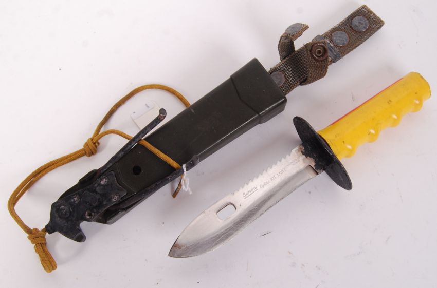 A 20th century John Nelson Cooper American survival knife, with yellow rubber ' John Cooper ' handle within the original scabbard. Measures 30cm long.