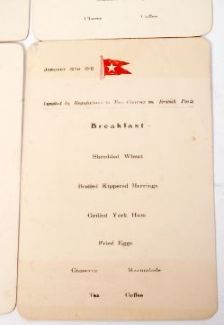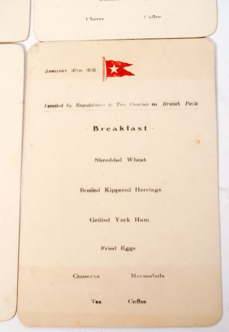 A rare set of WWI First World War period White Star Line menu cards - believed to be from RMS Olympic (sister ship to RMS Titanic ). The six menus run from January 11th 1918 to January 19th 1918. Comprising of Dinner, Breakfast & Luncheon menus (some for the same day). The White Star Line burgee embossed to top of each. Usually, the name of the ship is also impressed to the top but it was practise during war time for these names to not be present so as to remain anonymous. The final menu carries the text 'Limited by Regulations to Two Courses in British Ports'. During the First World War RMS Olympic was used as a troop carrying ship, and remains the only liner to have successfully rammed and sunk a German U Boat.  Each measures approx; 15.5cm x 10.5cm.
