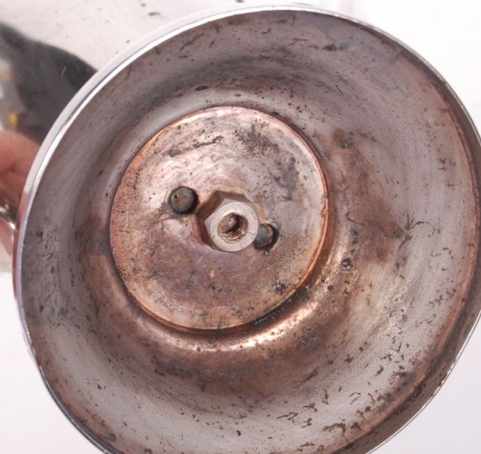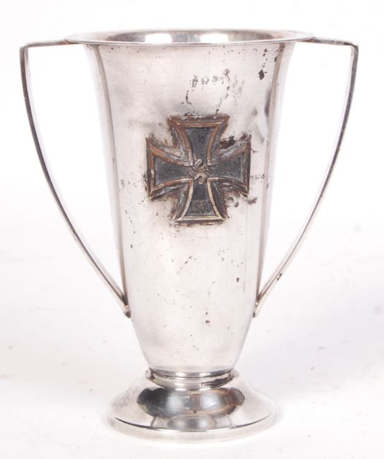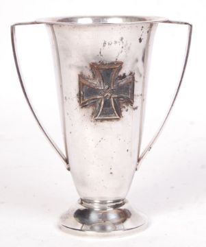 A mid 20th century silver plated chalice / goblet with inset WWII German Second World War style Third Reich Iron Cross medal. Dated 1939. No makers marks. Measures approx; 16cm tall.