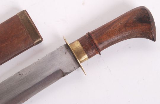 A 20th century Northern Indian wooden handled Bowie / hunting knife. Within brass banded wooden scabbard. Measures 25cm long.