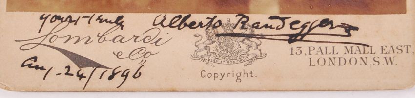 Alberto Randegger (13 April 1832 – 18 December 1911) was an Italian-born composer, conductor and singing teacher, best known for promoting opera and new works of British music in England during the Victorian era and for his widely used textbook on singing technique. Signed cabinet photograph. Depicts Randegger in a three-quarter pose, the autograph signed in fountain pen and dated Aug. 24th 1896. Size: 16.5cm x 10.5cm.